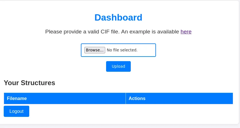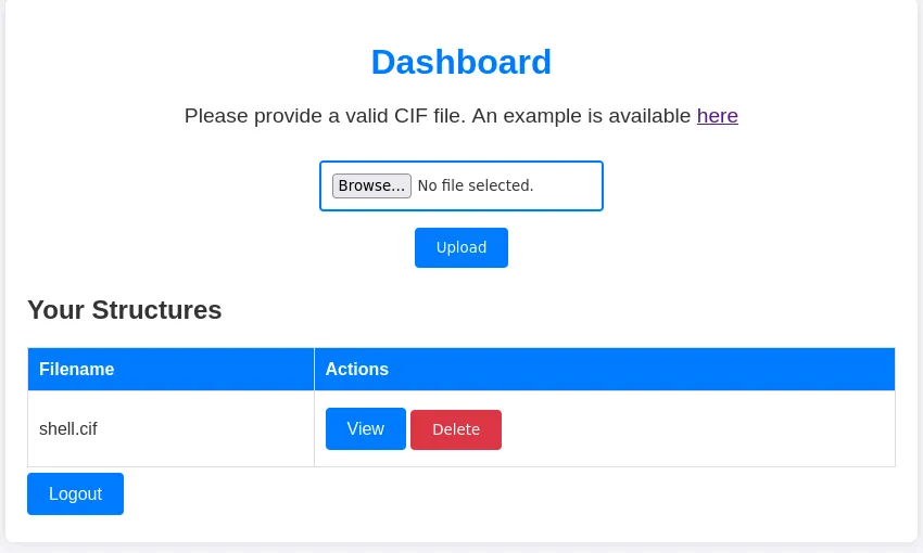 - Trying to do some file upload bypass did not give anything correct, but there is an example cif file format we can download on the path /static/example.cif