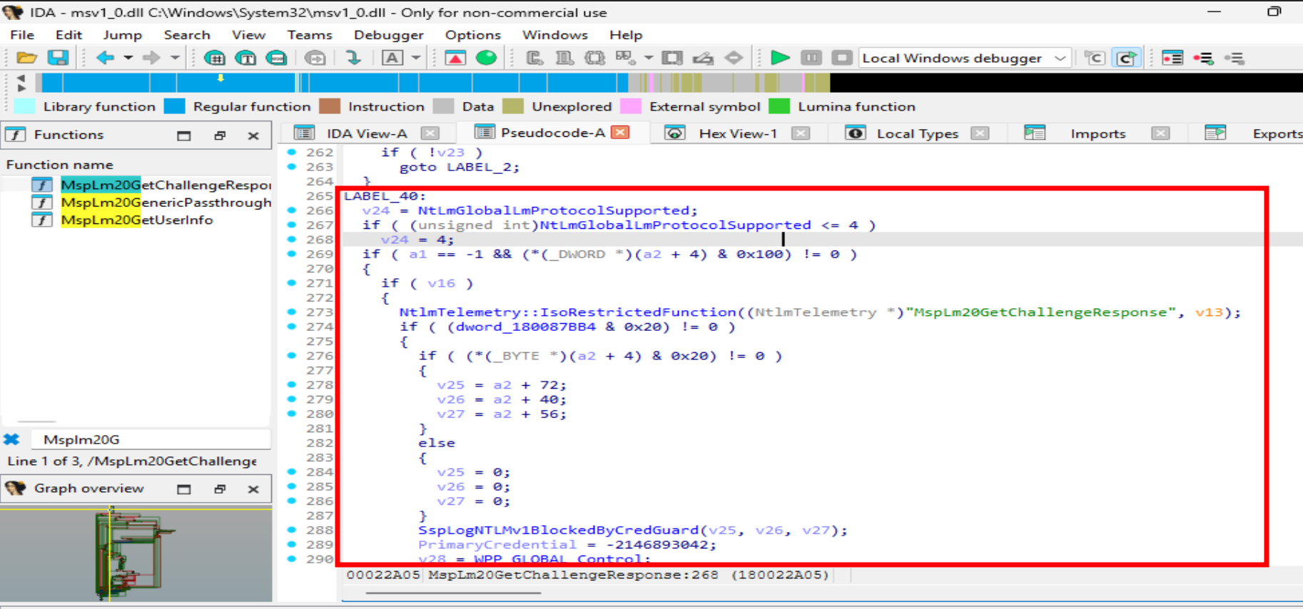NtLmGlobalLmProtocolSupported is the global variable that reflects LmCompatibilityLevel from the registry. On Server 2022, that value is read and used directly registry says 1, variable is 1, the rest of the function generates NTLMv1. On Server 2025, these three lines change everything. The registry value is read into v24, but immediately after there’s a check: if it’s less than or equal to 4, it gets replaced by 4. Value 4 maps to Send NTLMv2 response only the absolute minimum this function will ever agree to produce. v24 is then the variable used throughout the rest of the function to decide what response type to generate. Since v24 can never go below 4 on Server 2025, NTLMv1 is structurally impossible regardless of what is written in HKLM\SYSTEM\CurrentControlSet\Control\Lsa\LmCompatibilityLevel. The registry isn’t ignored it’s read, checked, and silently overridden if it’s too low. Subtle, but intentional.